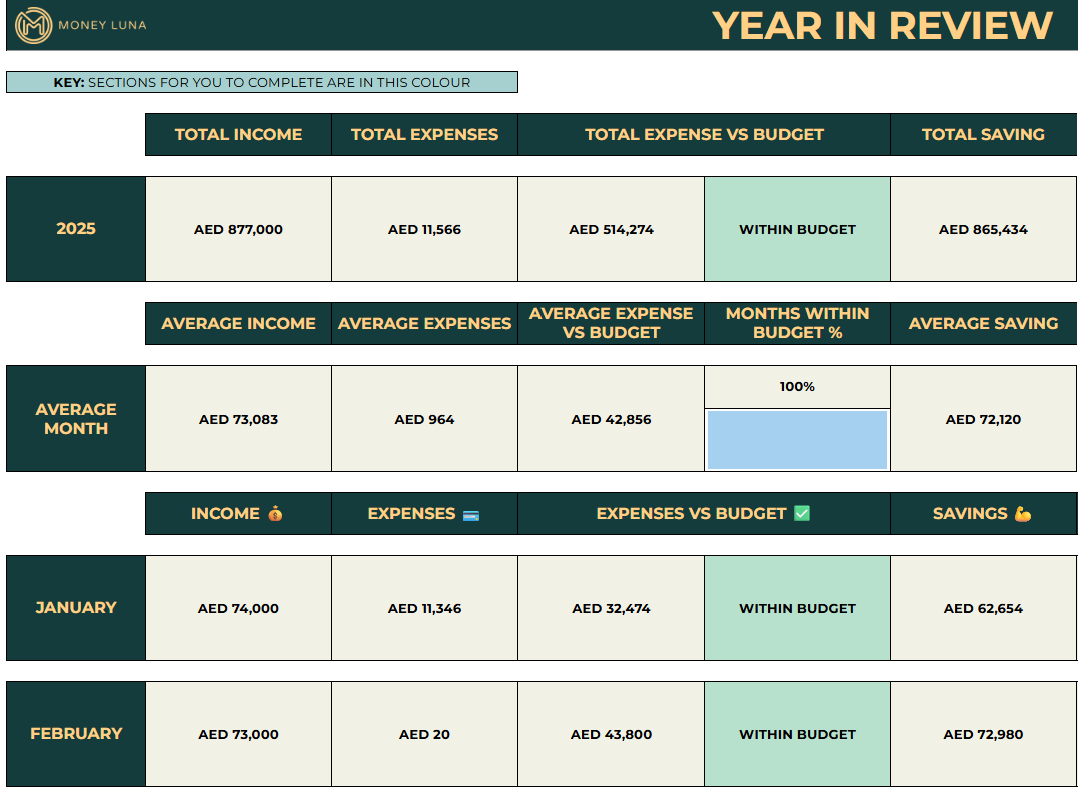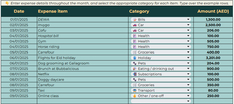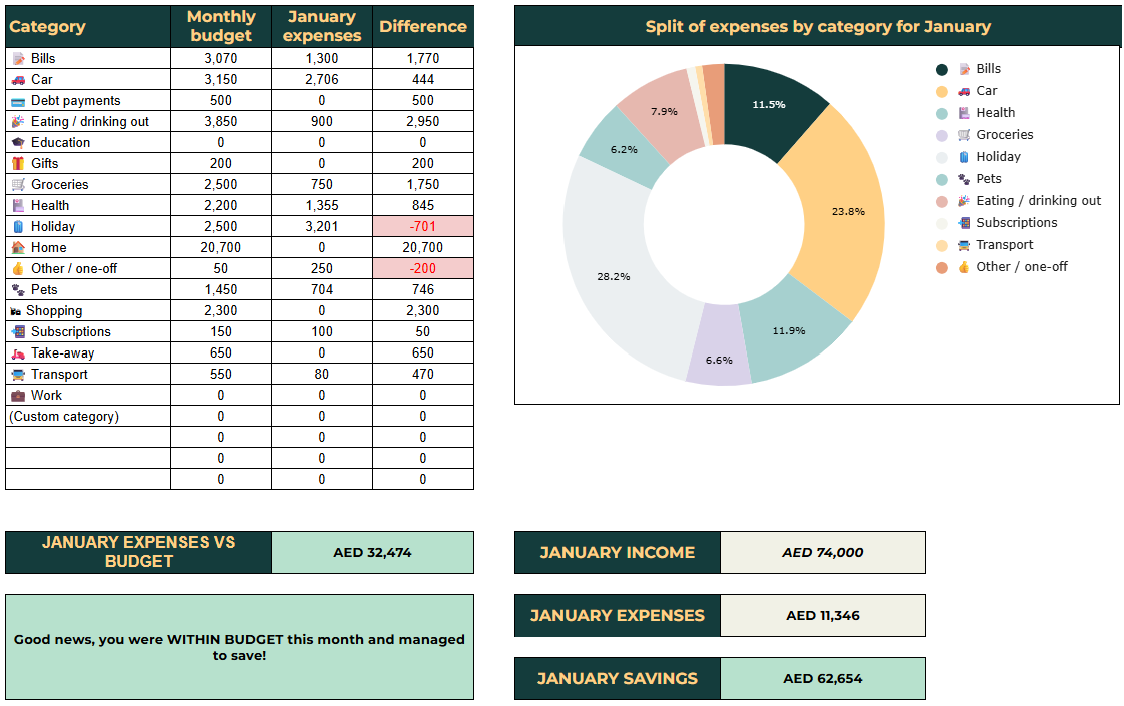 The planner maps every dirham coming in and going out across categories. You set a monthly budget, log your actuals, and the tool instantly shows where you're over or under - so you can make smarter decisions before money slips away.